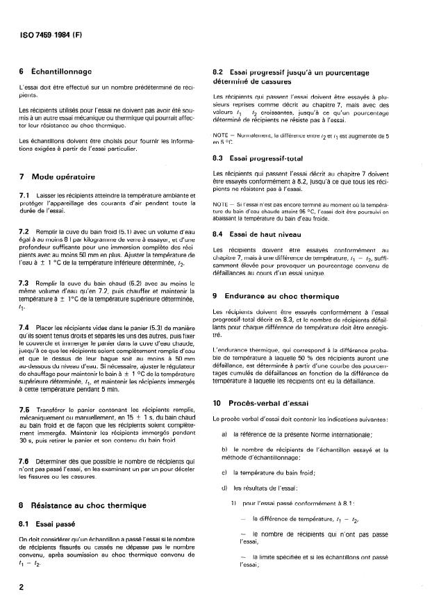 ISO 7459:1984 is a standard published by the International Organization for Standardization (ISO). Its full title is "Glass containers — Thermal shock resistance and thermal shock endurance — Test methods". This standard covers: The containers are subjected to a sudden change temperature, i.e. to cold and hot bath, for determing their performance. Apparatus, sampling and procedures are specified. The requirements apply only to containers made of soda-silica glass.