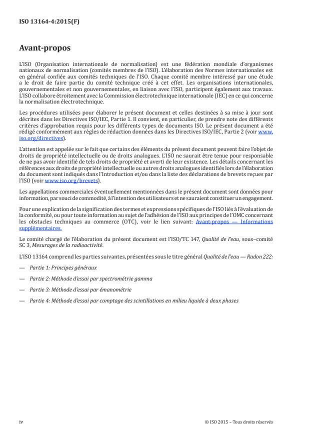 ISO 13164-4:2015 describes a test method for the determination of radon-222 (222Rn) activity concentration in non-saline waters by extraction and liquid scintillation counting. The radon-222 activity concentrations, which can be measured by this test method utilizing currently available instruments, are at least above 0,5 Bq l−1 for a 10 ml test sample and a measuring time of 1 h. This test method can be used successfully with drinking water samples and it is the responsibility of the laboratory to ensure the validity of this test method for water samples of untested matrices. Annex A gives indication on the necessary counting conditions to meet the required detection limits for drinking water monitoring.