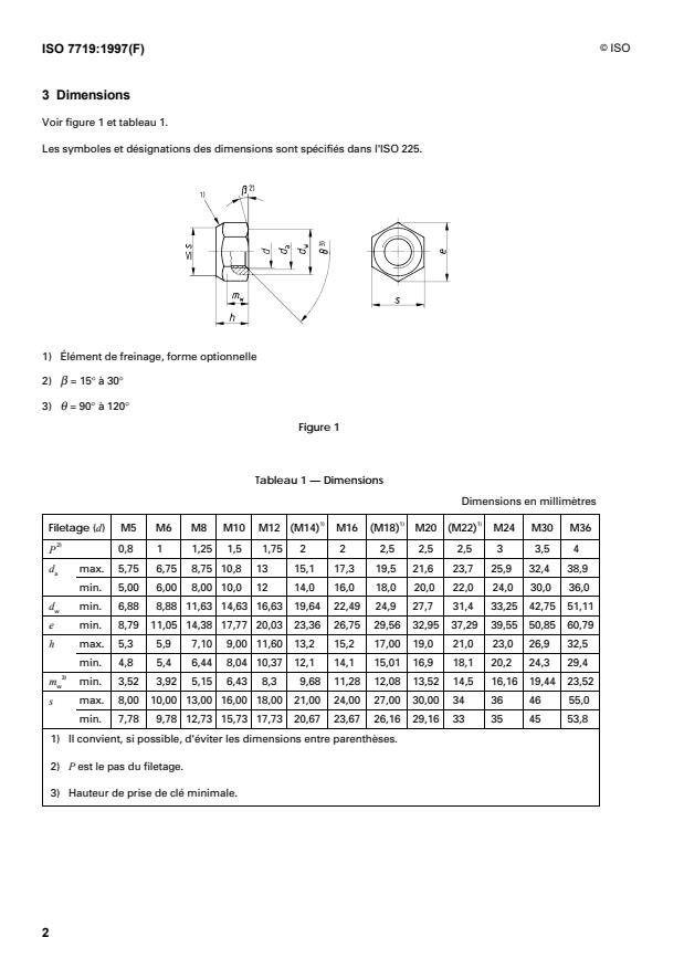 ISO 7719:1997 is a standard published by the International Organization for Standardization (ISO). Its full title is "Prevailing torque type all-metal hexagon nuts, style 1 — Property classes 5, 8 and 10". This standard covers: La présente Norme internationale prescrit les caractéristiques des écrous hexagonaux autofreinés tout métal, style 1, de filetage M5 à M36 inclus, de grade A pour filetages M16, et de classes de qualité 5, 8 et 10. NOTE -- Les dimensions des écrous, à l'exception de la dimension hmax′ sont conformes à celles données dans l'ISO 4032. Si d'autres spécifications sont requises, il est recommandé de les choisir dans les Normes internationales existantes, par exemple ISO 261, ISO 965-2, ISO 2320 et ISO 4759-1.