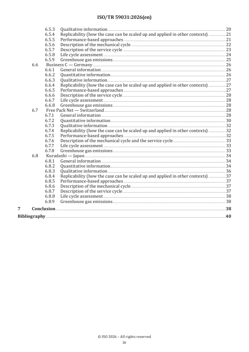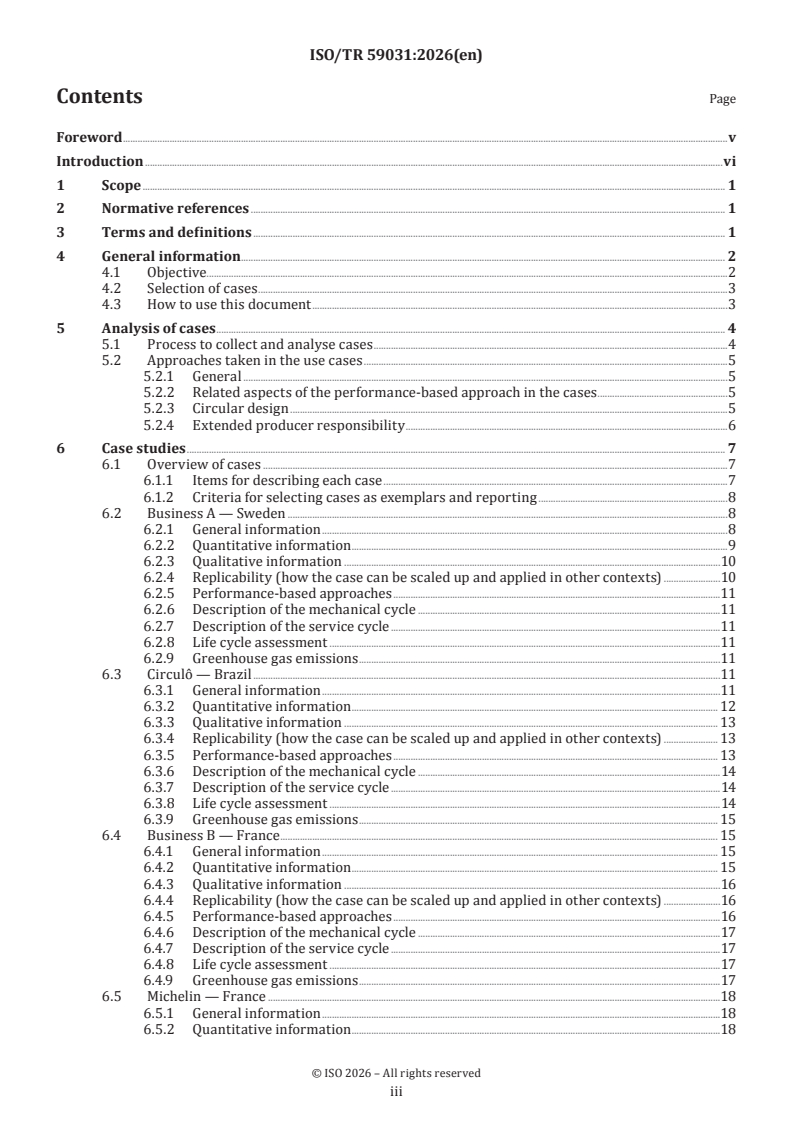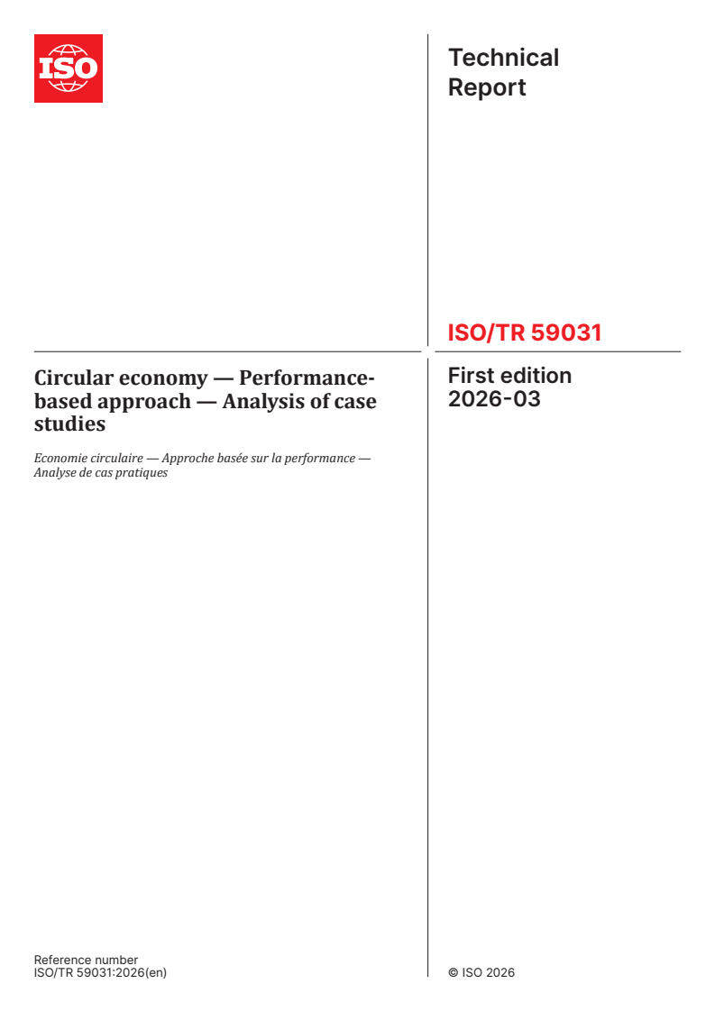 ISO/TR 59031:2026 is a technical report published by the International Organization for Standardization (ISO). Its full title is "Circular economy — Performance-based approach — Analysis of case studies". This standard covers: This document provides an analysis of various case studies for the implementation of specific aspects of the circular economy in organizations, regardless of their status. This document specifically focuses on performance-based approaches such as functional economy, service economy, product-as-a-service (PaaS) and other performance-based approaches. This document mainly describes a selection of use cases of operational implementation of such performance-based approaches as observed in different organizations. It stresses the challenging context faced by concerned organizations in changing their economic and business models. This document depicts cultural, organizational and industrial changes induced by the move of business models toward a performance-based approach. It emphasizes to what extent the total economic value can increase and how this is converted into revenue streams for the concerned organizations. This document does not apply to the implementation of any circular economy domain of actions (circular design, recycling; responsible purchase policy, etc.), but focuses on the systemic level of development of economic models based on the commercialization of various performance aspects.