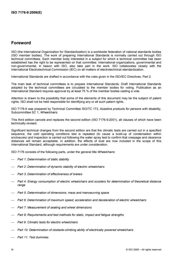 ISO 7176-9:2009 is a standard published by the International Organization for Standardization (ISO). Its full title is "Wheelchairs - Part 9: Climatic tests for electric wheelchairs". This standard covers: ISO 7176‑9:2009 specifies requirements and test methods to determine the effects of rain, dust, condensation and the effects of changes of temperature on the basic functioning of electrically powered wheelchairs, including scooters, intended to carry one person, with a maximum speed not exceeding 15 km/h. ISO 7176‑9:2009 does not include requirements for resistance to corrosion.