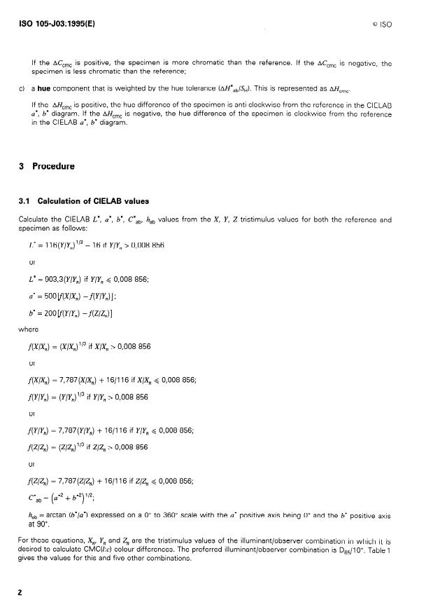 ISO 105-J03:1995 is a standard published by the International Organization for Standardization (ISO). Its full title is "Textiles — Tests for colour fastness — Part J03: Calculation of colour differences". This standard covers: Provides a method of calculating the colour difference between two specimens of the same textil material, measured under the same conditions. Permits the specification of a maximum value and provides a means for establishing the ratio of differences in lightness to chroma and to hue. Partial revision of the third edition of ISO 105-J01.