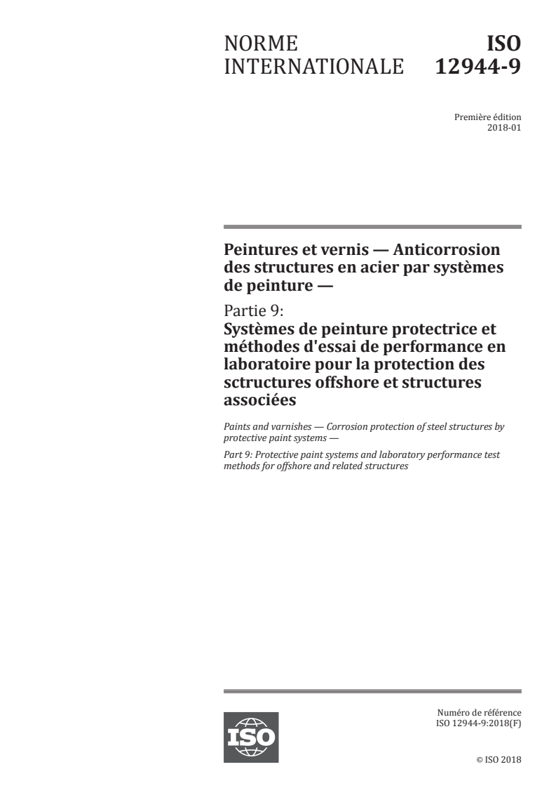ISO 12944-9:2018 - Peintures et vernis — Anticorrosion des structures en acier par systèmes de peinture — Partie 9: Systèmes de peinture protectrice et méthodes d'essai de performance en laboratoire pour la protection des structures offshore et structures associées Released:1/31/2018