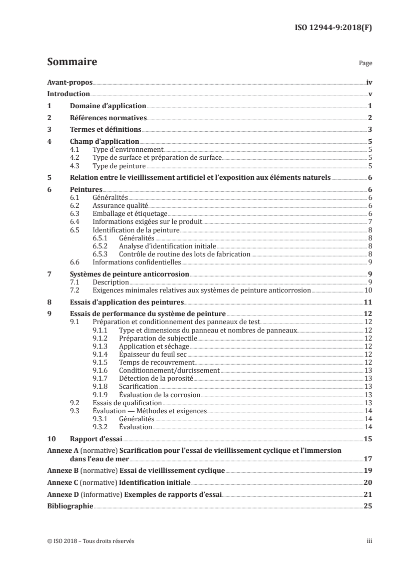- Assessment criteria: Quantitative criteria and evaluation methods for corrosion, blistering, rusting and other degradations (references to ISO test methods such as ISO 4624, ISO 2812-2 appear in the normative references).