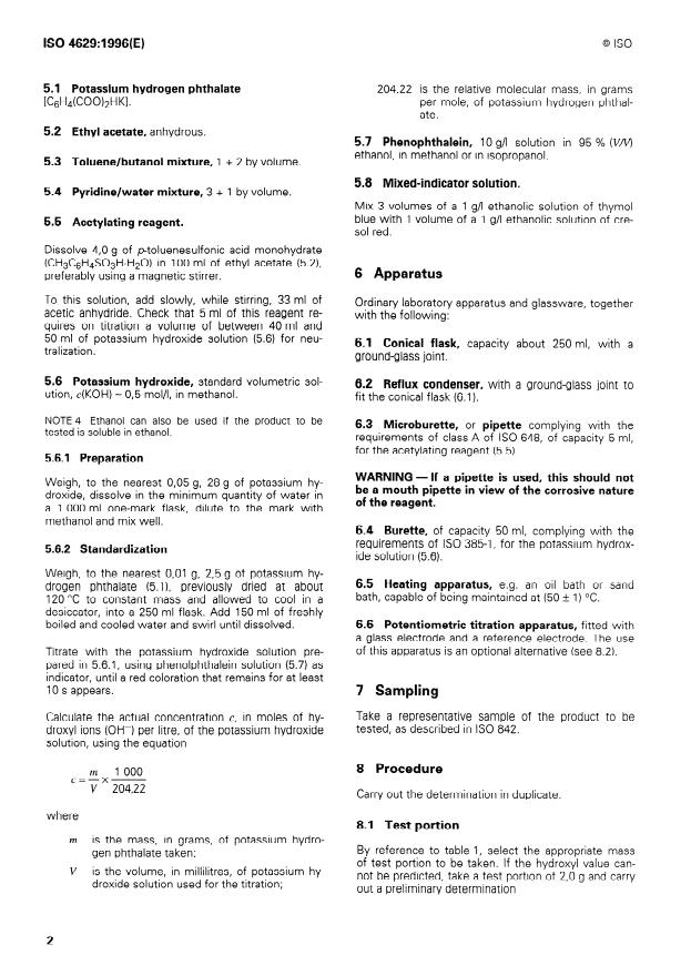 ISO 4629:1996 is a standard published by the International Organization for Standardization (ISO). Its full title is "Binders for paints and varnishes — Determination of hydroxyl value — Titrimetric method". This standard covers: Specifies a titrimetric method for determining the free hydroxyl groups in binders and binder solutions for paints and varnishes. The hydroxyl groups may be present as polyhydric alcohols, partial esters, polyester end groups or hydroxylated fatty acids. Replaces the first edition.