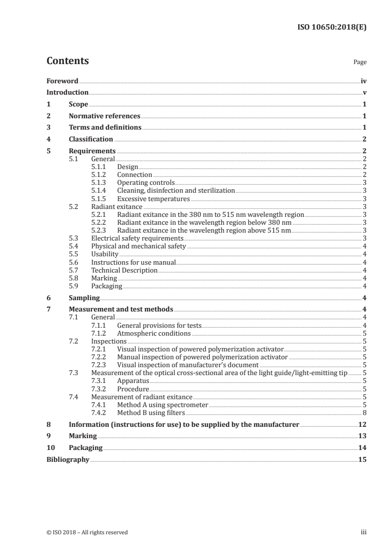 ISO 10650:2018 specifies safety, performance and test requirements for powered polymerization activators (dental light‑curing units) that emit primarily in the 380 nm to 515 nm wavelength region for chairside polymerization of dental polymer‑based materials. The standard applies to quartz‑tungsten‑halogen and LED lamps, including mains‑powered and rechargeable battery units, and sets limits and test methods for optical output, electrical/ mechanical safety, usability, marking, instructions and packaging. Lasers, plasma‑arc devices and laboratory‑only curing units for indirect restorations are excluded.