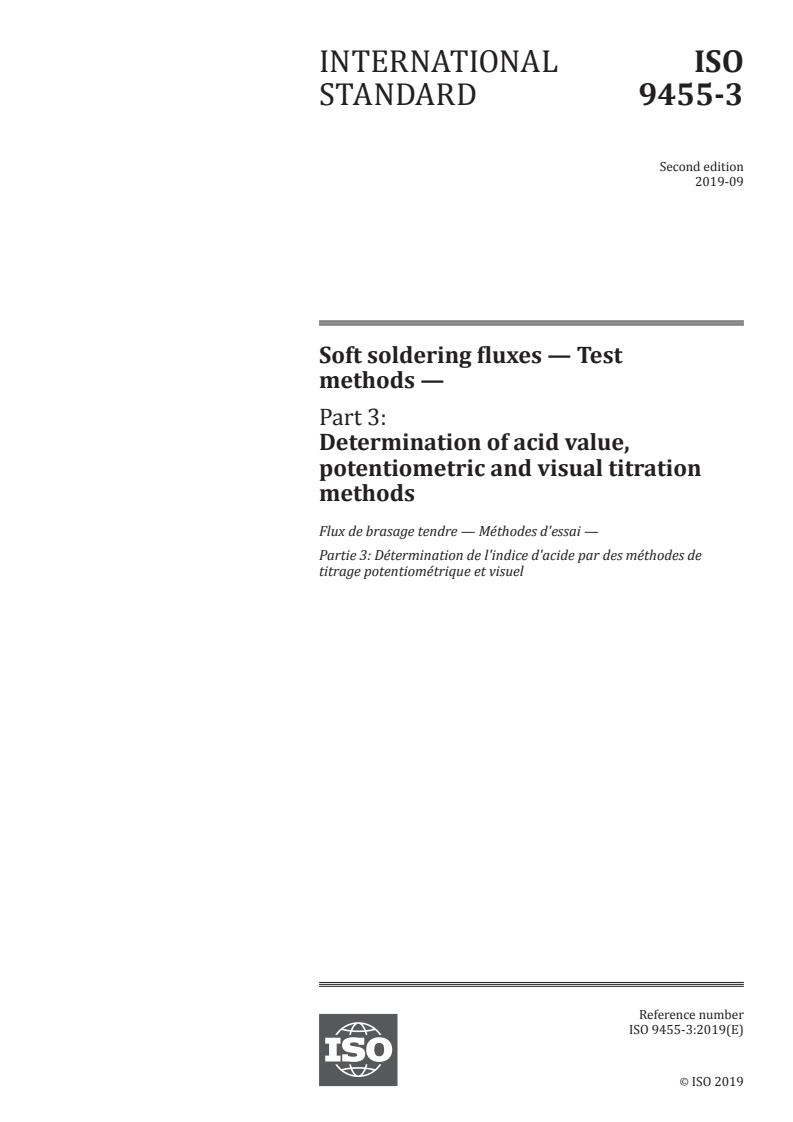 ISO 9455-3:2019 is a standard published by the International Organization for Standardization (ISO). Its full title is "Soft soldering fluxes — Test methods — Part 3: Determination of acid value, potentiometric and visual titration methods". This standard covers: This document specifies two methods for the determination of the acid value of a flux of types 1 and 2 only, as defined in ISO 9454‑1. Method A is a potentiometric titration method and is to be considered as the reference method. Method B is an alternative, visual end‑point, titration method.