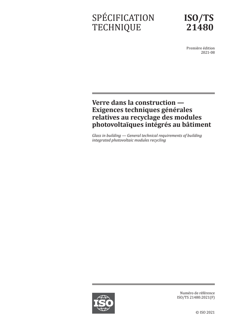 ISO/TS 21480:2021 - Verre dans la construction — Exigences techniques générales relatives au recyclage des modules photovoltaïques intégrés au bâtiment Released:9/28/2021