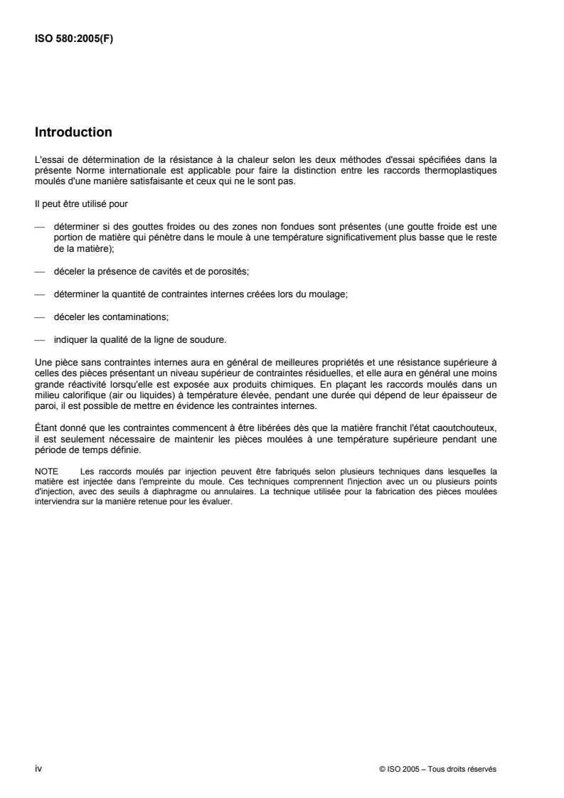 L'ISO 580:2005 spécifie deux méthodes d'essai, la méthode A qui utilise une étuve et la méthode B un bain liquide, pour estimer visuellement les effets de la chaleur sur des raccords de canalisations thermoplastiques moulés par injection. En cas de désaccord, la méthode A est utilisée comme méthode de référence. L'ISO 580:2005 s'applique aux raccords à coller, y compris aux raccords à brides, aux raccords munis d'une bague d'étanchéité en élastomère et aux raccords constitués par l'assemblage de plusieurs éléments moulés (par exemple les raccords union). Elle s'applique à la fois aux raccords sous pression et aux raccords sans pression.
