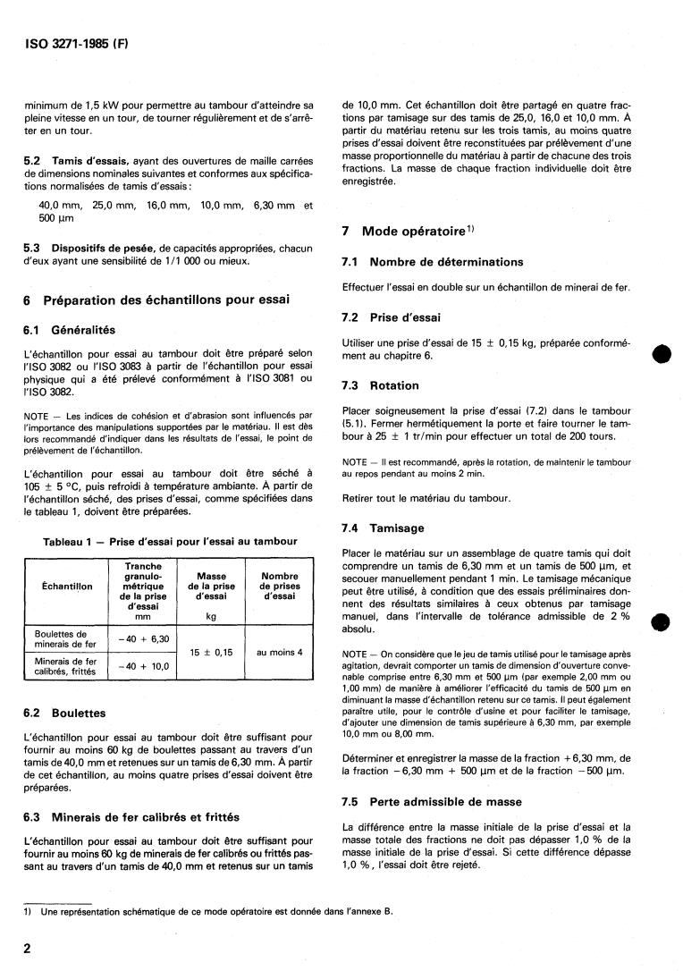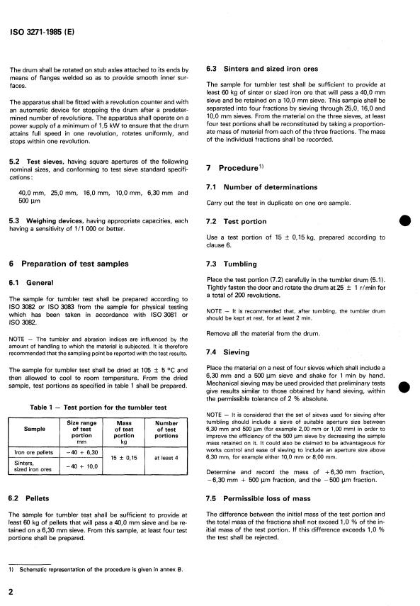 ISO 3271:1985 is a standard published by the International Organization for Standardization (ISO). Its full title is "Iron ores — Determination of tumbler strength". This standard covers: Iron ores — Determination of tumbler strength