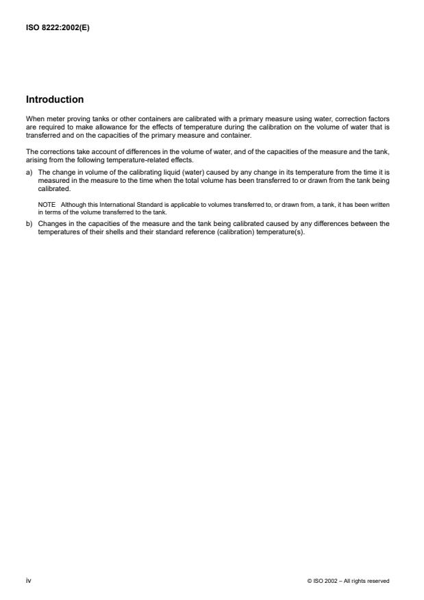 ISO 8222 specifies multiplication factors for the correction of the volume of water transferred from a primary measure to a tank for changes arising from temperature differences during the determination of the capacity of the tank at reference temperature.