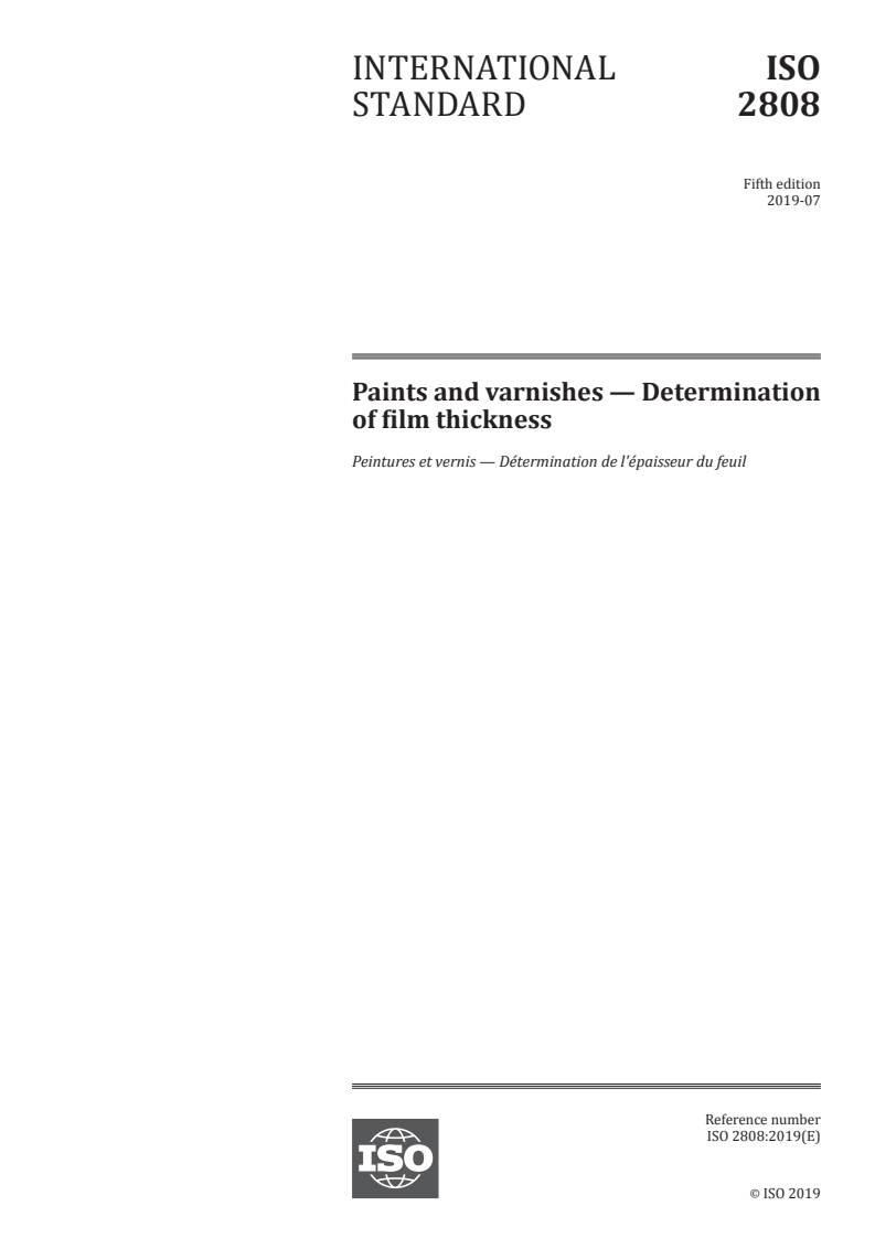 ISO 2808:2019 - Paints and varnishes — Determination of film thickness Released:7/26/2019