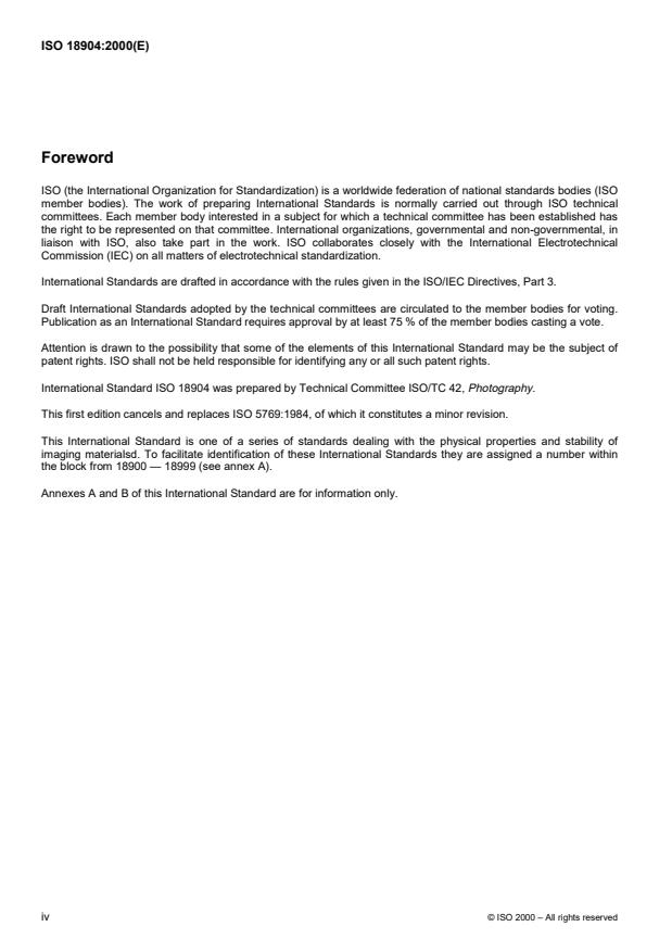 ISO 18904:2000 is part of the ISO 18900–18999 block for imaging materials. It replaced ISO 5769:1984. Related ISO documents in the same block address stability, storage and other physical tests for photographic materials (see ISO 18901, ISO 18903, ISO 18906, etc.). For implementation, consult the full ISO 18904:2000 text for figures, calibration details and reporting formats.