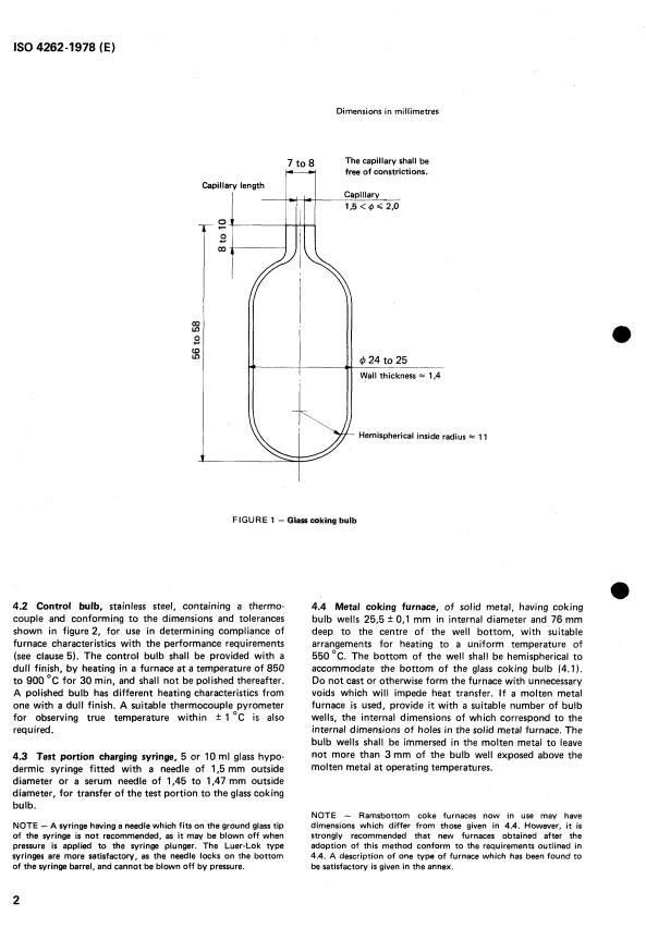 ISO 4262:1978 is a standard published by the International Organization for Standardization (ISO). Its full title is "Petroleum products — Determination of carbon residue — Ramsbottom method". This standard covers: Petroleum products — Determination of carbon residue — Ramsbottom method