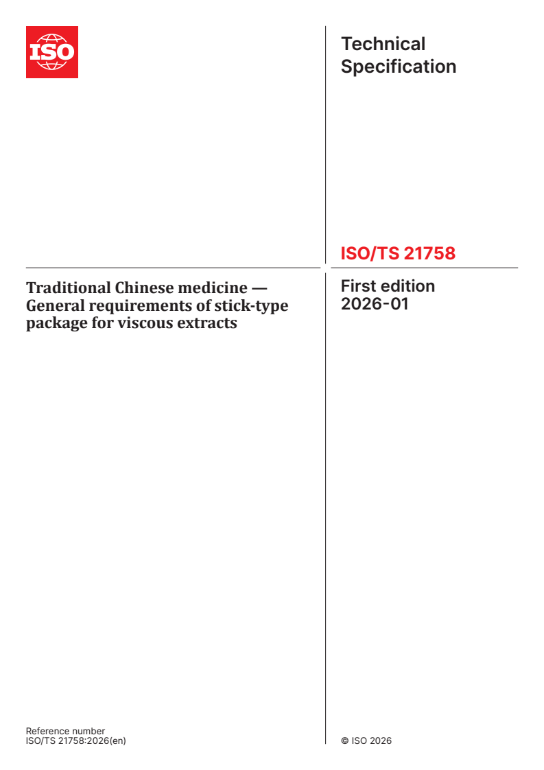 ISO/TS 21758:2026 is a technical specification published by the International Organization for Standardization (ISO). Its full title is "Traditional Chinese medicine — General requirements of stick-type package for viscous extracts". This standard covers: This document specifies the general requirements for the safety and quality of stick-type single-dose package for viscous extracts. This document does not apply to solid dosage forms.