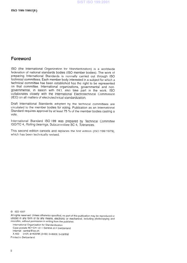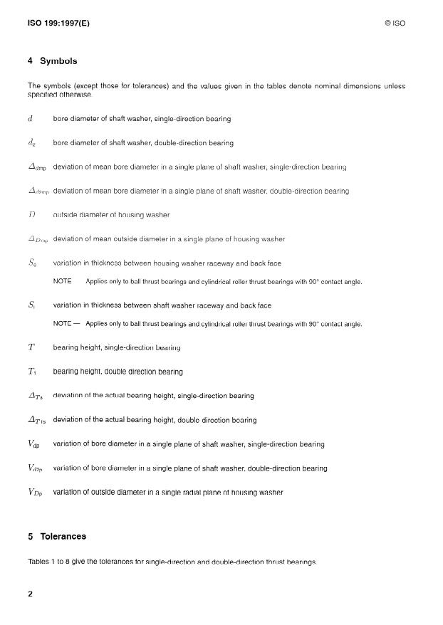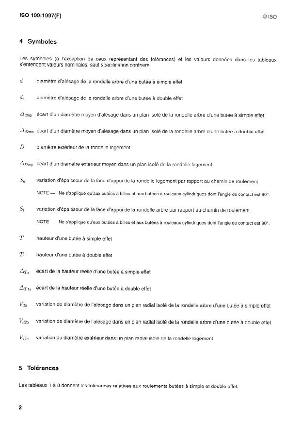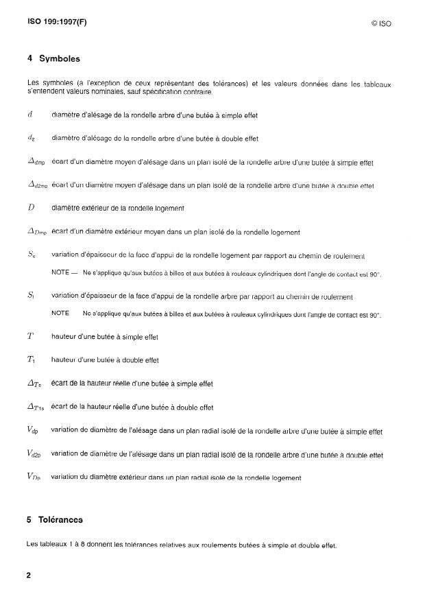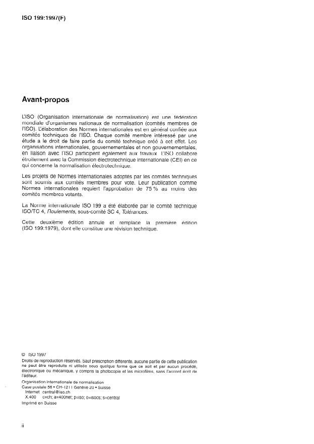 ISO 199:1997 is a standard published by the International Organization for Standardization (ISO). Its full title is "Rolling bearings — Thrust bearings — Tolerances". This standard covers: La présente Norme internationale prescrit les tolérances applicables aux dimensions d'encombrement (sauf les dimensions d'arrondi) et celles applicables à l'exactitude de rotation des butées à rondelles plates spécifiée dans l'ISO 104. La présente Norme internationale n'est pas applicable à certaines butées, par exemple roulements butées à aiguilles, ou à certains domaines d'utilisation, par exemple roulements butées de précision spéciale. Les dimensions limites des arrondis sont données dans l'ISO 582.