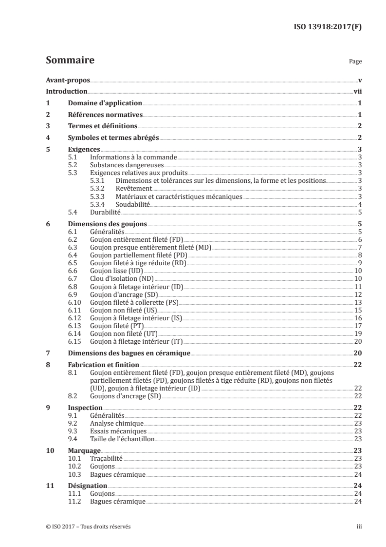 ISO 13918:2017 specifies the following: - requirements for studs and ceramic ferrules for arc stud welding; - dimensions, materials and mechanical properties.