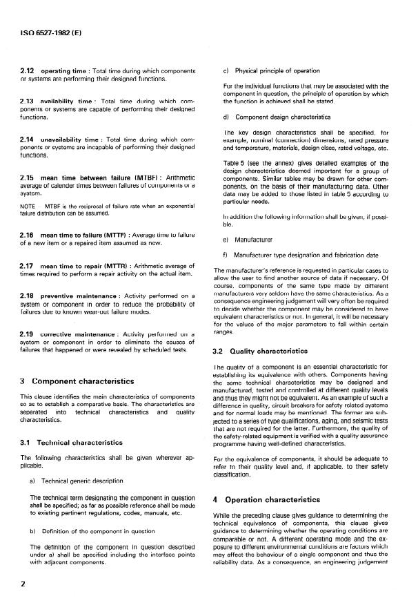 Identifies the typical parameters of a component that permit it to be characterized unequivocally and to allow the corresponding reliability data to be associated with those of other components having equivalent typical parameters. Parameters refer to technical characteristics including the physical principle of operation and quality level and to actual operating conditions and maintenance and test intervals. Data may be represented both in a historical and in a statistical form.