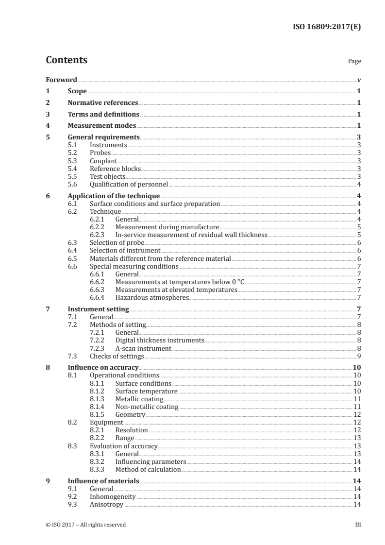 ISO 16809:2017 specifies the principles for ultrasonic thickness measurement of metallic and non-metallic materials by direct contact, based on measurement of time of flight of ultrasonic pulses only.