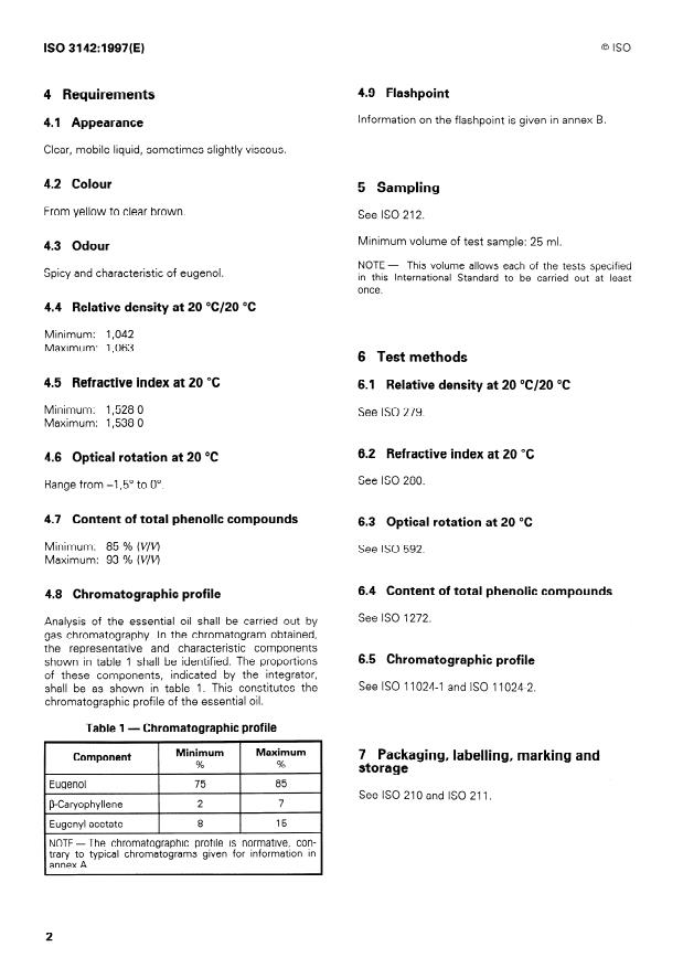 ![ISO 3142:1997 ISO 3142:1997 - Oil of clove buds [Syzygium aromaticum (L.) Merr. et Perry, syn. Eugenia caryophyllus (Sprengel) Bullock et S. Harrison] - Page 4 preview](https://cdn.standards.iteh.ai/images/8312/5cec7962addf4d23b800a26b69ed855b/page4.jpg)