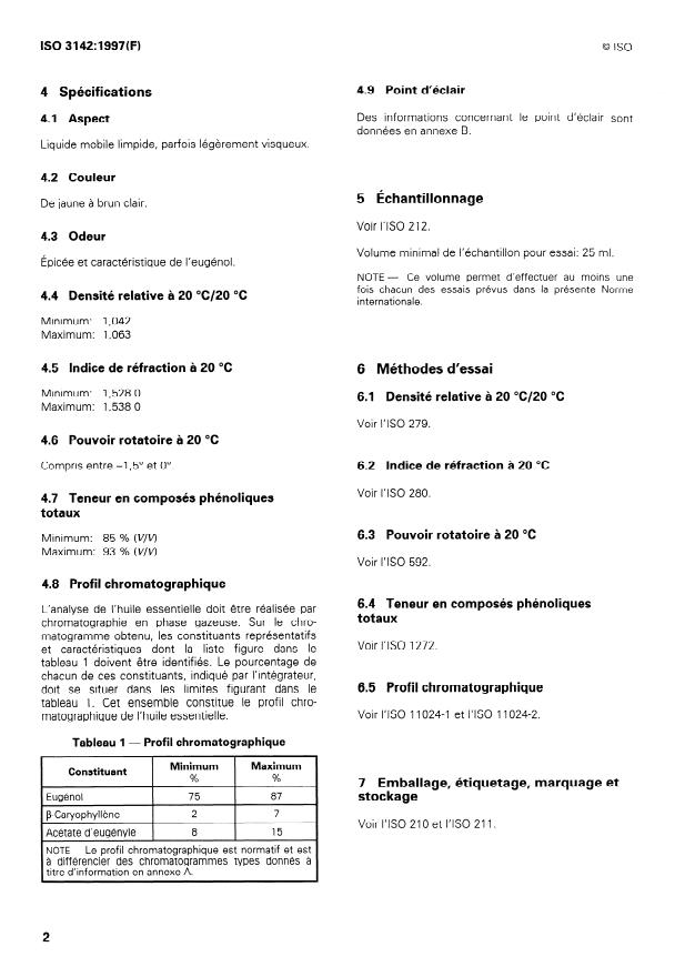 ![ISO 3142:1997 ISO 3142:1997 - Huile essentielle de clous de giroflier [Syzygium aromaticum (L.) Merr. et Perry, syn. Eugenia caryophyllus (Sprengel) Bullock et S. Harrison] - Page 3 preview](https://cdn.standards.iteh.ai/images/8312/63efa73df829414b834ee77236ba59d2/page3.jpg)