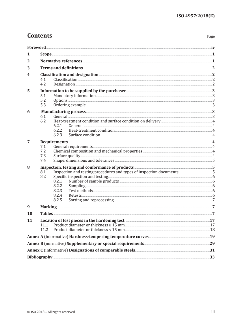 ISO 4957:2018 defines the technical framework suppliers and purchasers must follow. Major topics include:
