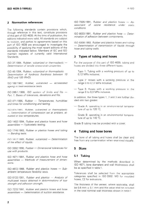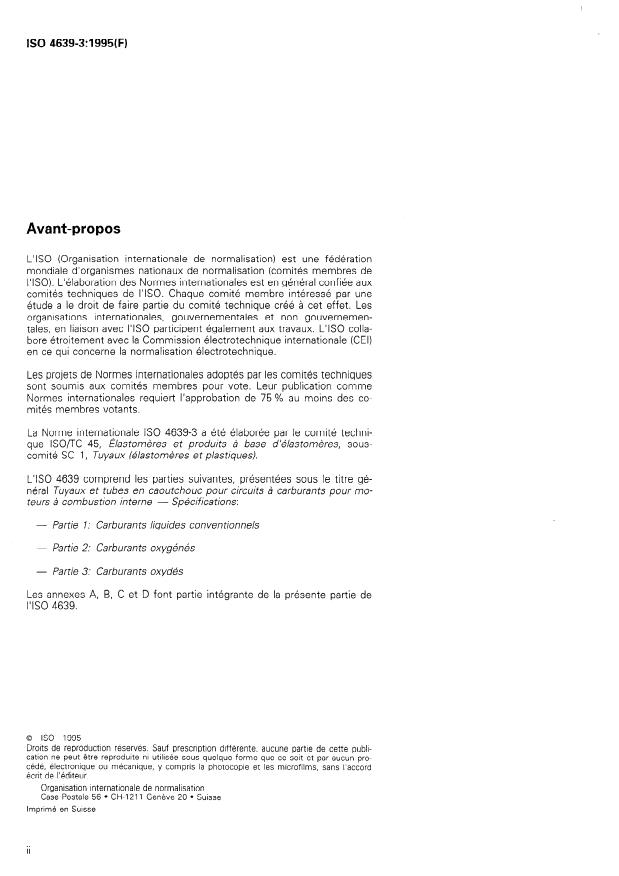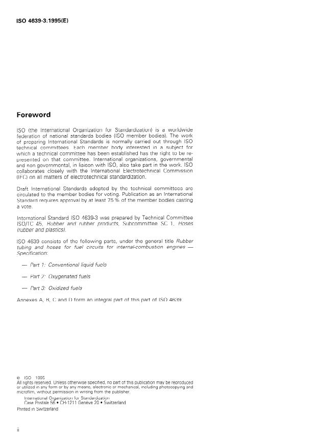ISO 4639-3:1995 is a standard published by the International Organization for Standardization (ISO). Its full title is "Rubber tubing and hoses for fuel circuits for internal-combustion engines — Specification — Part 3: Oxidized fuels". This standard covers: Specifies requirements for rubber tubing and hoses for use in fuel circuits where the fuel can become oxidized or "sour". Does not cover any equipment used for the distribution of liquid fuels, nor tubing totally immersed in fuel tanks. The hoses and tubing are used in recirculating fuel injection systems and in other systems which, having been charged with fuel, may be subject to exceptional storage conditions at high ambient temperatures.