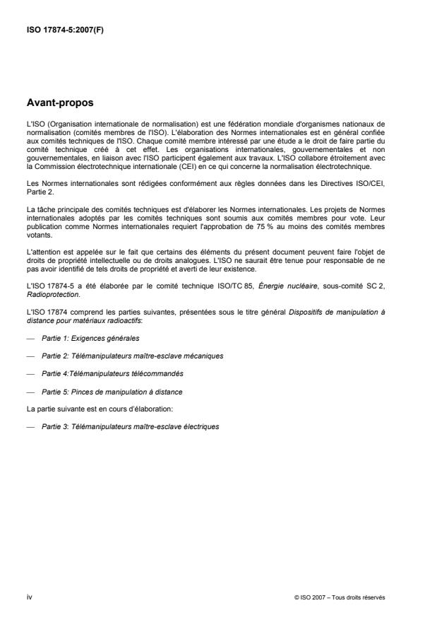 ISO 17874-5:2007 is a standard published by the International Organization for Standardization (ISO). Its full title is "Remote handling devices for radioactive materials - Part 5: Remote handling tongs". This standard covers: The purpose of ISO 17874-5:2007 is to provide guidance for the selection, installation and use of manually-operated remote handling tongs within nuclear installations. ISO 17874-5:2007 covers only the specific engineering aspects of manually-operated remote handling tongs and their interfaces with the nuclear facilities in which these devices are to be installed. Specifically, ISO 17874-5:2007 does not address design options concerning aspects such as the process and general maintenance arrangements that lead to the selection of any particular type of remote handling device.