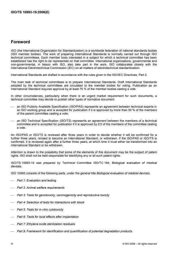 ISO/TS 10993-19:2006 is a technical specification published by the International Organization for Standardization (ISO). Its full title is "Biological evaluation of medical devices — Part 19: Physico-chemical, morphological and topographical characterization of materials". This standard covers: ISO/TS 10993-19:2006 provides a compilation of parameters and test methods that can be useful for the identification and evaluation of the physico-chemical, morphological and topographical (PMT) properties of materials in finished medical devices. Such an assessment is limited to those properties that are relevant to biological evaluation and the medical device's intended use (clinical application and duration of use) even if such properties overlap with clinical effectiveness.