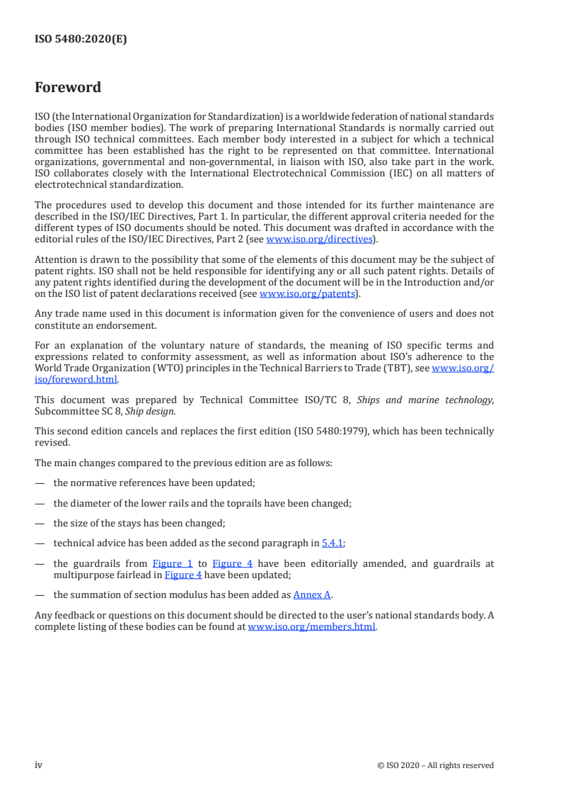 ISO 5480:2020 - Ships and marine technology - Guardrails for cargo ships - specifies the dimensions, materials, manufacture and finish requirements for guardrails and stanchions fitted on exposed freeboard and superstructure decks of cargo ships. Its purpose is to reduce the risk of personnel falling overboard or to lower decks. The standard applies to cargo ships (excluding guardrails fitted near compasses) and aligns cargo-ship design with the International Convention on Loadlines (Annex 1, Ch. II, Reg. 25).