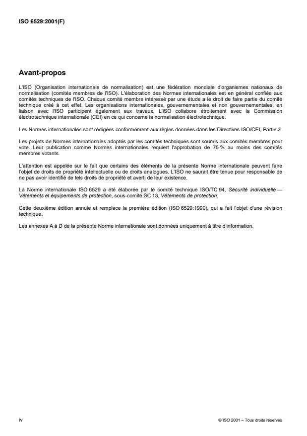 ISO 6529:2001 is a standard published by the International Organization for Standardization (ISO). Its full title is "Protective clothing — Protection against chemicals — Determination of resistance of protective clothing materials to permeation by liquids and gases". This standard covers: La présente Norme internationale décrit des méthodes d'essai en laboratoire permettant de déterminer, pour les matériaux utilisés dans les vêtements de protection, la résistance à la perméation par les produits chimiques liquides ou gazeux dans des conditions de contact continu ou intermittent. La méthode A est applicable quand le produit chimique d'essai est un liquide, volatil ou soluble dans l'eau, destiné à être en contact continu avec le matériau du vêtement de protection.La méthode B est applicable quand le produit chimique d'essai est un gaz, destiné à être en contact continu avec le matériau du vêtement de protection.La méthode C est applicable quand le produit chimique d'essai est un liquide, volatil ou soluble dans l'eau, destiné à être en contact intermittent avec le matériau du vêtement de protection.Ces méthodes d'essai ne se prêtent qu'aux essais de matériaux de protection imperméables à l'air. Elles permettent de déterminer la résistance à la perméation du matériau du vêtement de protection dans des conditions de laboratoire en termes de temps de passage, de flux de perméation et de perméation cumulée. Ces méthodes d'essai permettent également d'observer les effets du liquide d'essai sur le matériau du vêtement de protection soumis à essai.Ces méthodes d'essai ne traitent que de la performance des matériaux ou de certains types de fabrication de matériaux (coutures par exemple) utilisés dans les vêtements de protection. Ces méthodes d'essai ne couvrent pas la conception, la fabrication générale ou les composants, ni les zones de jonction de vêtements ou autres facteurs à même d'avoir un effet sur la protection globale offerte par le vêtement de protection.Il est à signaler que ces essais ne simulent pas nécessairement les conditions dans lesquelles les matériaux du vêtement de protection sont susceptibles d'être exposés dans la pratique.Il convient par conséquent de limiter l'utilisation des données d'essai à une simple évaluation comparative de ce
