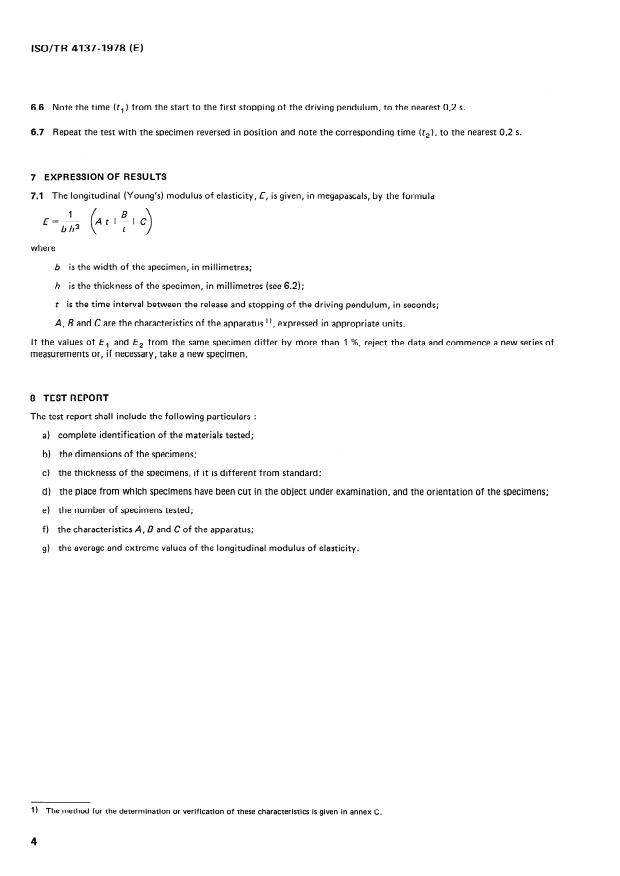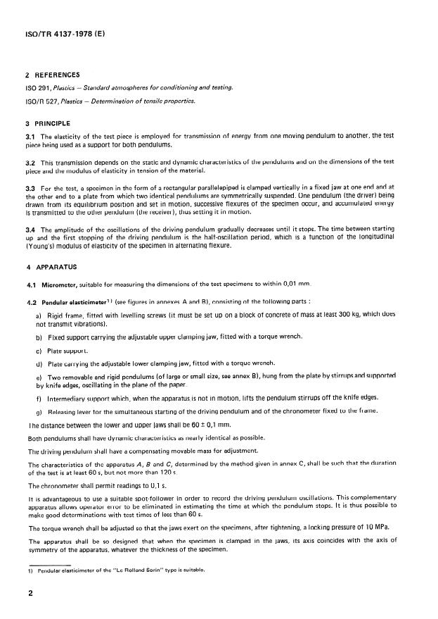 ISO/TR 4137:1978 is a technical report published by the International Organization for Standardization (ISO). Its full title is "Plastics — Determination of modulus of elasticity by alternating flexure". This standard covers: This report describes a method for the determination of the longitudinal moduls of elasticity of plastics by means of Savarts pendulum. The method is applicable to products for which the characteristic determined is greater than 1500 MPa and which it is possible to prepare specimens from 1 to 5 mm in thickness by cutting. The elasticity of the test piece is employed for the transmission of energy from one pendulum to another, the test piece being used as a support for both pendulums. The amplitude of the oscillations of the driving pendulum gradually decreases until it stops. The time between starting up and the first stopping of the driving pendulum is the half-oscillation period, which is a function of the longitudinal (Young's) moduls ofelasticity of the specimen in alternating flexure.
