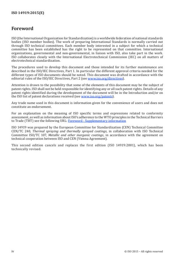 ISO 14919:2015 is a standard published by the International Organization for Standardization (ISO). Its full title is "Thermal spraying — Wires, rods and cords for flame and arc spraying — Classification — Technical supply conditions". This standard covers: ISO 14919:2015 specifies requirements for classification of metal and non-metal wires (solid and cored), rods, cords processed by means of thermal spraying, especially by arc and flame spraying.