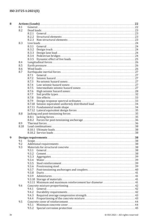 - Actions (loads): dead loads, live loads (design truck/lane loads), dynamic effects, longitudinal forces, earth pressure, wind and seismic loads, thermal forces, jacking and post‑tensioning actions, and specified load combinations.