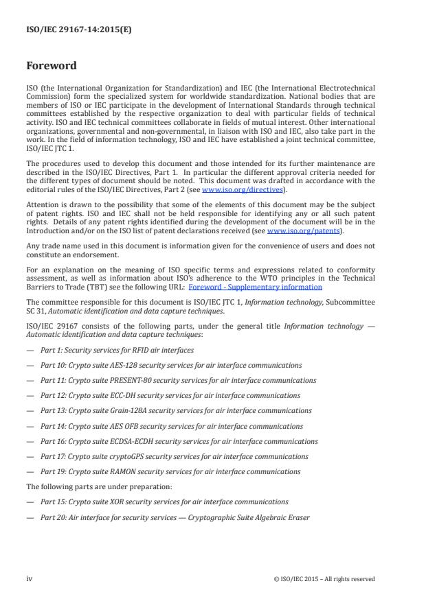 ISO/IEC 29167-14:2015 is a standard published by the International Organization for Standardization (ISO). Its full title is "Information technology - Automatic identification and data capture techniques - Part 14: Crypto suite AES OFB security services for air interface communications". This standard covers: ISO/IEC 29167-14:2015 defines the cryptographic suite for AES using OFB mode (AES OFB) for the ISO/IEC 18000‑63 air interface standard for radio frequency identification (RFID) devices. Its purpose is to provide a common cryptographic suite for security for RFID devices that can be referenced by ISO committees for air interface standards and application standards. ISO/IEC 29167-14:2015 specifies a cryptographic suite for AES OFB for air interface for RFID systems. The cryptographic suite is defined in alignment with existing air interfaces. ISO/IEC 29167-14:2015 defines various authentication methods and methods of use for the cipher. A tag and an interrogator can support one, a subset, or all of the specified options, clearly stating what is supported.