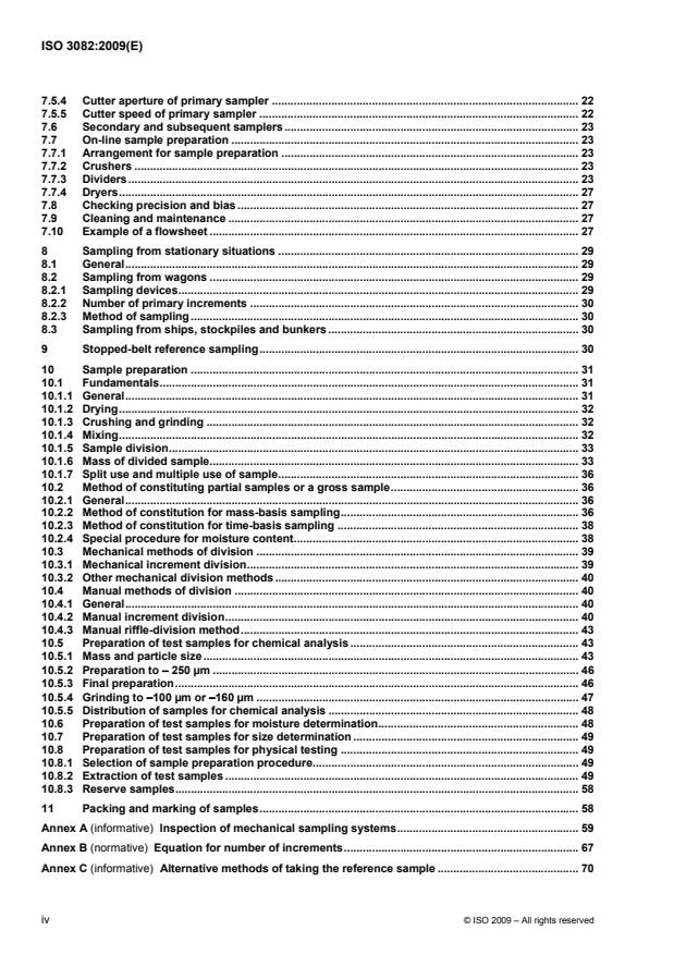ISO 3082:2009 is a standard published by the International Organization for Standardization (ISO). Its full title is "Iron ores — Sampling and sample preparation procedures". This standard covers: ISO 3082:2009 gives a) the underlying theory, b) the basic principles for sampling and preparation of samples, and c) the basic requirements for the design, installation and operation of sampling systems for mechanical sampling, manual sampling and preparation of samples taken from a lot under transfer, to determine the chemical composition, moisture content, size distribution and other physical and metallurgical properties of the lot, except bulk density obtained using ISO 3852:2007 (Method 2). The methods specified in this ISO 3082:2009 are applicable to both the loading and discharging of a lot by means of belt conveyors and other ore-handling equipment to which a mechanical sampler may be installed or where manual sampling may safely be conducted. The methods are applicable to all iron ores, whether natural or processed (e.g. concentrates and agglomerates, such as pellets or sinters).