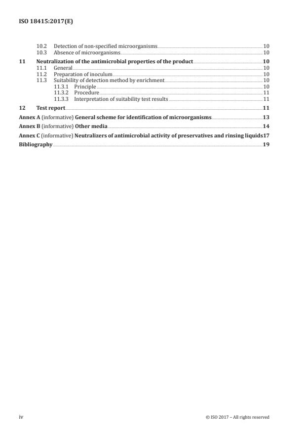 ISO 18415:2017 gives general guidelines for the detection and identification of specified microorganisms in cosmetic products as well as for the detection and identification of other kinds of aerobic mesophilic non-specified microorganisms in cosmetic products. Microorganisms considered as specified in this document might differ from country to country according to national practices or regulations. Most of them considered as specified microorganisms include one or more of the following species: Pseudomonas aeruginosa, Escherichia coli, Staphylococcus aureus and Candida albicans. In order to ensure product quality and safety for consumers, it is advisable to perform an appropriate microbiological risk analysis to determine the types of cosmetic products to which this document is applicable. Products considered to present a low microbiological risk (see ISO 29621) include those with low water activity, hydro-alcoholic products, extreme pH values, etc. The method described in this document is based on the detection of microbial growth in a non-selective liquid medium (enrichment broth) suitable to detect microbial contamination, followed by isolation of microorganisms on non-selective agar media. Other methods can be appropriate depending on the level of detection required. In ISO 18415:2017 specific indications are given for identification of Pseudomonas aeruginosa, Escherichia coli, Staphylococcus aureus and Candida albicans. Other microorganisms that grow under the conditions described in this document may be identified by using suitable tests according to a general scheme (see Annex A). Other standards (e.g. ISO 18416, ISO 21150, ISO 22717, ISO 22718) may be appropriate. Because of the large variety of cosmetic products within this field of application, this method might not be suited in every detail to some products (e.g. certain water-immiscible products). Other methods (e.g. automated) can be substituted for the tests presented here provided that their equivalence has been demonstrated or the method has been otherwise shown to be suitable.