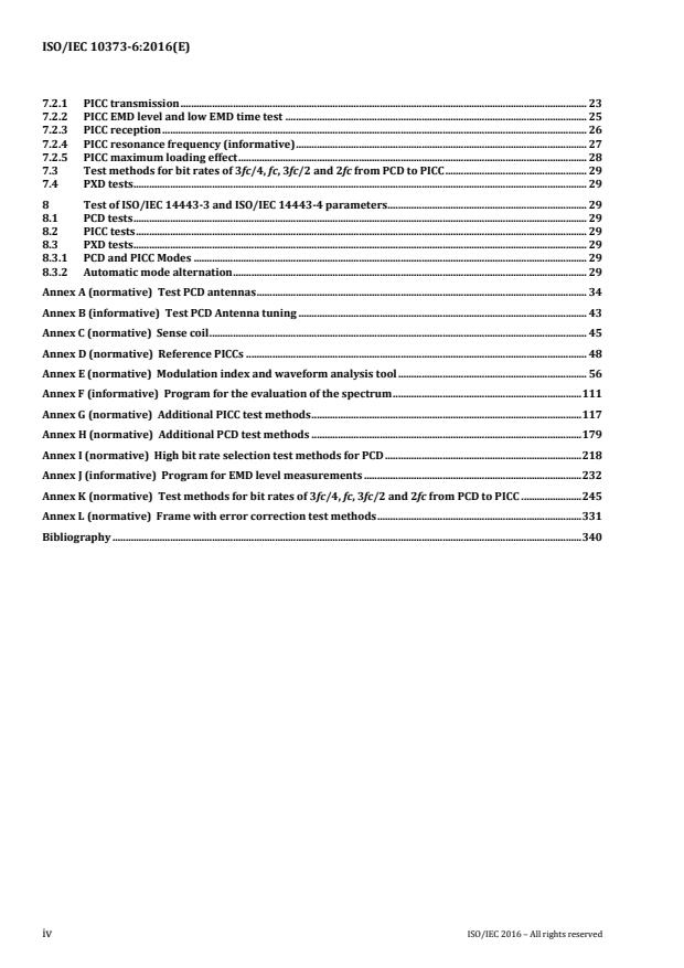 ISO/IEC 10373-6:2016 defines test methods for characteristics of identification cards according to the definition given in ISO/IEC 7810. Each test method is cross‑referenced to one or more base standards, which can be ISO/IEC 7810 or one or more of the supplementary standards that define the information storage technologies employed in identification card applications. NOTE 1 Criteria for acceptability do not form part of ISO/IEC 10373-6 :2016, but will be found in the International Standards mentioned above. NOTE 2 Test methods defined in ISO/IEC 10373-6 :2016 are intended to be performed separately. A given proximity card or object, or proximity coupling device, is not required to pass through all the tests sequentially. ISO/IEC 10373-6:2016 defines test methods which are specific to proximity cards and objects, and proximity coupling devices and proximity extended devices, defined in ISO/IEC 14443‑1, ISO/IEC 14443‑2, ISO/IEC 14443‑3, and ISO/IEC 14443‑4. ISO/IEC 10373‑1 defines test methods which are common to one or more integrated circuit card technologies and other parts deal with other technology‑specific tests.