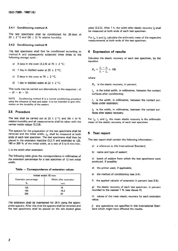 ISO 7389:1987 is a standard published by the International Organization for Standardization (ISO). Its full title is "Building construction — Jointing products — Determination of elastic recovery". This standard covers: Specifies a conventional method for the determination of the elastic recovery of sealants after extension and applies to sealants used in joints in building construction. Contains test method (preparation and conditioning of test specimen, procedure), expression of results, and test report.