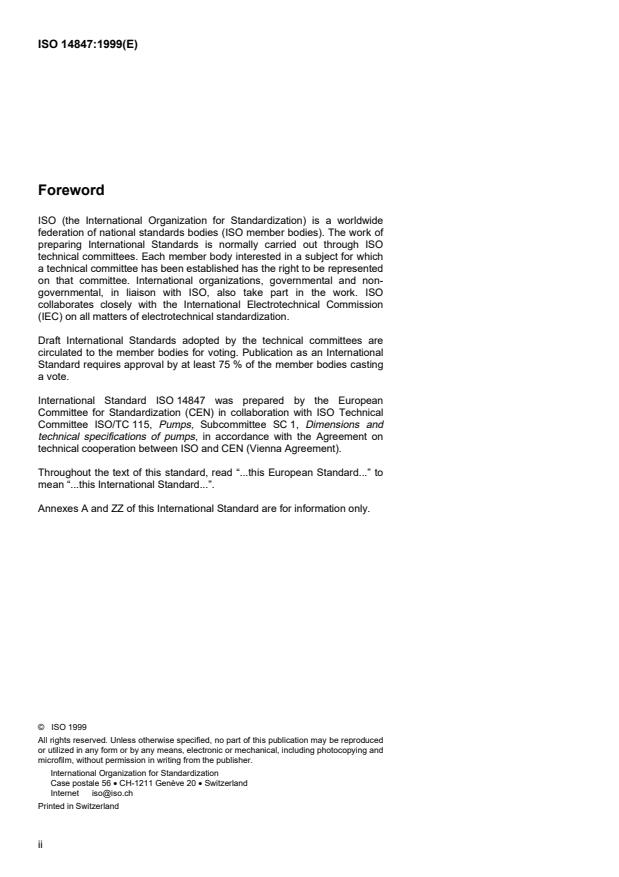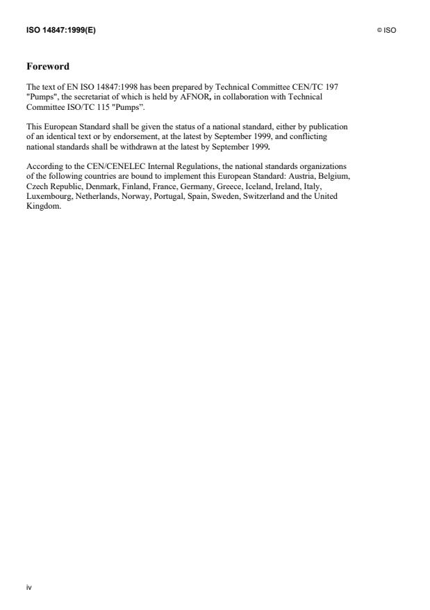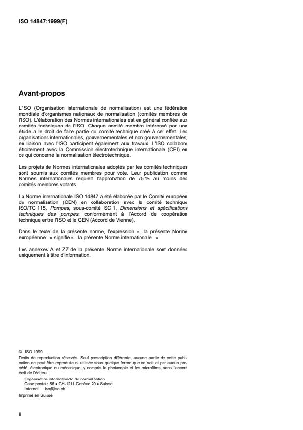 ISO 14847:1999 is a standard published by the International Organization for Standardization (ISO). Its full title is "Rotary positive displacement pumps - Technical requirements". This standard covers: La présente norme spécifie les prescriptions techniques, autres que les prescriptions de sécurité et les essais, pour les pompes volumétriques et groupes motopompes volumétriques à mouvement rotatif. La présente norme internationale ne s'applique pas aux pompes volumétriques à mouvement rotatif pour transmissions hydrauliques et pneumatiques.