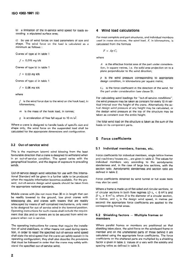 ISO 4302:1981 is a standard published by the International Organization for Standardization (ISO). Its full title is "Cranes — Wind load assessment". This standard covers: Gives a simplified method of calculation and assumes that the wind blows horizontal from any direction, that the wind blows at a constant velocity and that there is a static reaction to the loadings applying to the crane structure. Includes built-in allowances for the effects of gusting (rapid changes in wind velocity) and for dynamic response.