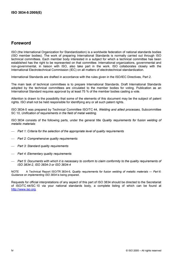 ISO 3834-5:2005 is a standard published by the International Organization for Standardization (ISO). Its full title is "Quality requirements for fusion welding of metallic materials — Part 5: Documents with which it is necessary to conform to claim conformity to the quality requirements of ISO 3834-2, ISO 3834-3 or ISO 3834-4". This standard covers: ISO 3834-5:2005 specifies the documents with which it is necessary to conform to claim conformity to the quality requirements of ISO 3834-2, ISO 3834-3 or ISO 3834-4It can only be used in conjunction with ISO 3834-2, ISO 3834-3 or ISO 3834-4.