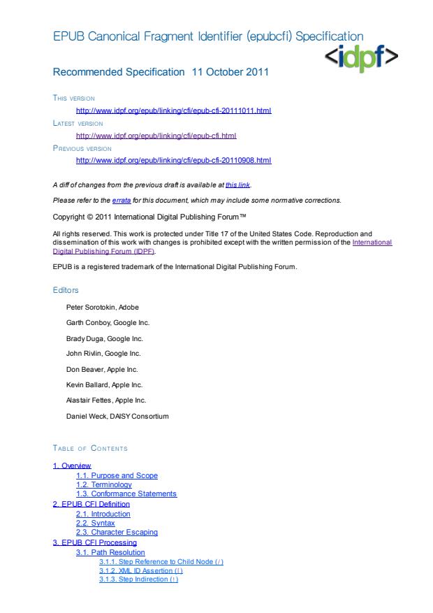 This specification, EPUB Canonical Fragment Identifier (epubcfi), defines a standardized method for referencing arbitrary content within an EPUB® Publication through the use of fragment identifiers. The Web has proven that the concept of hyperlinking is tremendously powerful, but EPUB Publications have been denied much of the benefit that hyperlinking makes possible because of the lack of a standardized scheme to link into them. Although proprietary schemes have been developed and implemented for individual Reading Systems, without a commonly-understood syntax there has been no way to achieve cross-platform interoperability. The functionality that can see significant benefit from breaking down this barrier, however, is varied: from reading location maintenance to annotation attachment to navigation, the ability to point into any Publication opens a whole new dimension not previously available to developers and Authors. This specification attempts to rectify this situation by defining an arbitrary structural reference that can uniquely identify any location, or simple range of locations, in a Publication: the EPUB CFI. The following considerations have strongly influenced the design and scope of this scheme: · The mechanism used to reference content should be interoperable: references to a reading position created by one Reading System should be usable by another. · Document references to EPUB content should be enabled in the same way that existing hyperlinks enable references throughout the Web. · Each location in an EPUB file should be able to be identified without the need to modify the document. · All fragment identifiers that reference the same logical location should be equal when compared. · Comparison operations, including tests for sorting and comparison, should be able to be performed without accessing the referenced files. · Simple manipulations should be possible without access to the original files (e.g., given a reference deep in a file, it should be possible to generate a reference to the start of the file). · Identifier resolution should be reasonably efficient (e.g., processing of the first chapter is not required to resolve a fragment identifier that points to the last chapter). · References should be able to recover their target locations through parser variations and document revisions. · Expression of simple, contiguous ranges should be supported. · An extensible mechanism to accommodate future reference recovery heuristics should be provided.