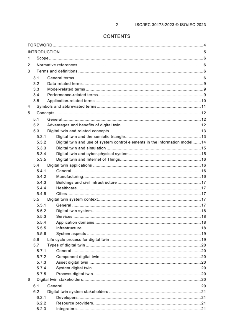 - Prepared by ISO/IEC JTC1/SC41 (Internet of Things and Digital Twin), ISO/IEC 30173:2023 is intended to support the development of other standards and to harmonize terminology across existing digital twin, IoT and cyber‑physical system standards. Users should consult domain‑specific standards for normative technical requirements where applicable.