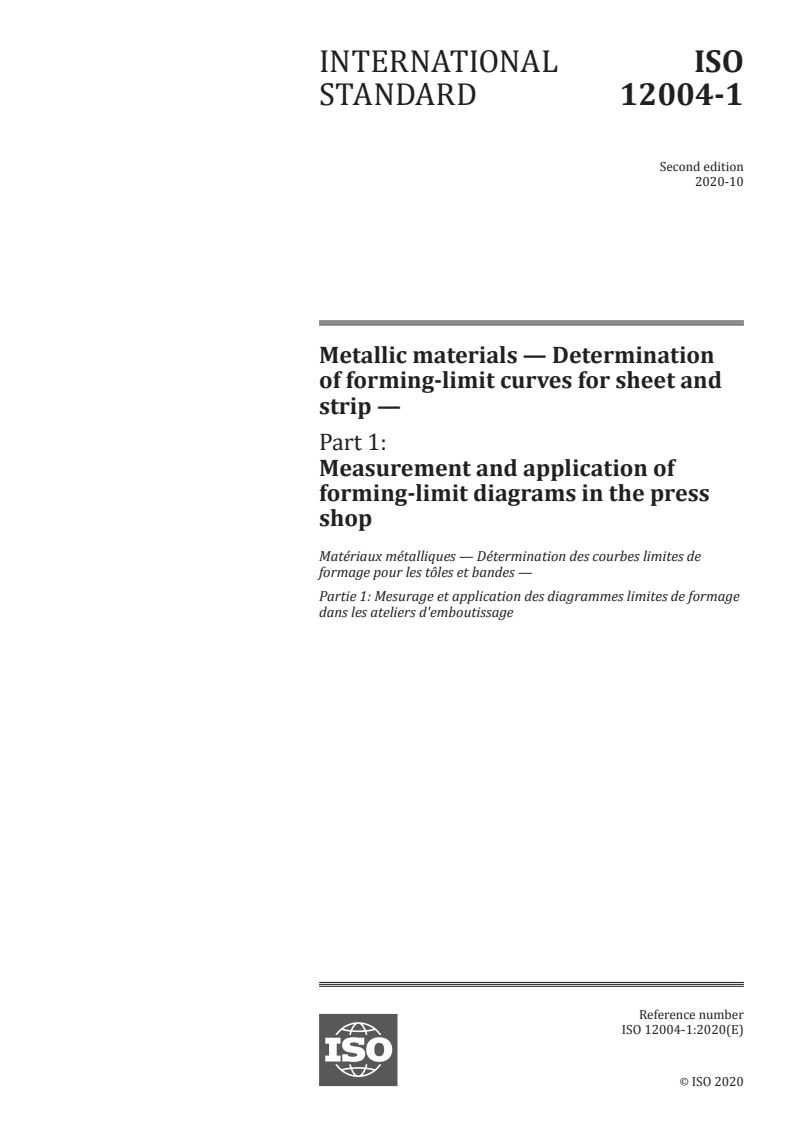 ISO 12004-1:2020 is a standard published by the International Organization for Standardization (ISO). Its full title is "Metallic materials — Determination of forming-limit curves for sheet and strip — Part 1: Measurement and application of forming-limit diagrams in the press shop". This standard covers: This document specifies a procedure for developing forming-limit diagrams and forming-limit curves for metal sheets and strips of thicknesses from 0,3 mm to 4 mm.