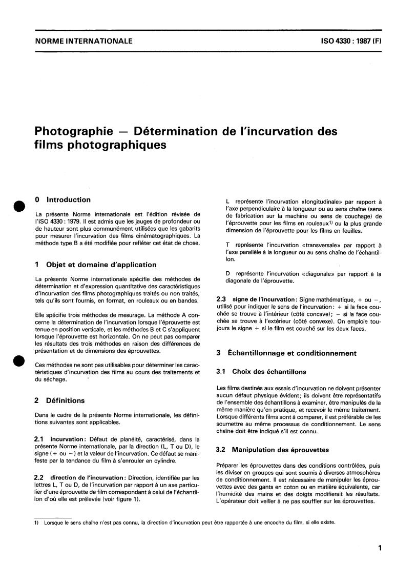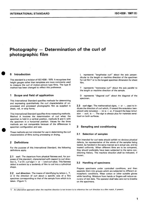 ISO 4330:1987 - Photography — Determination of the curl of photographic film Released:10/15/1987