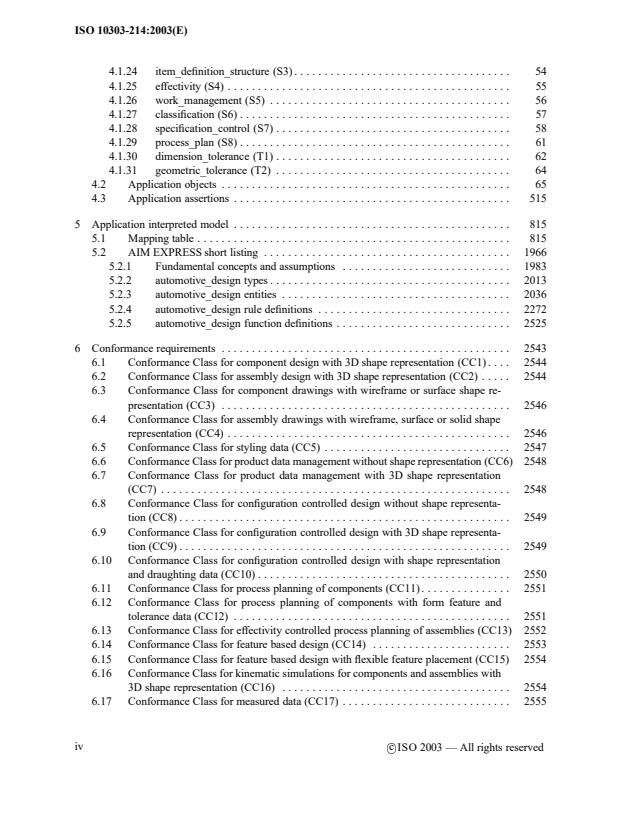 ISO 10303-214:2003 specifies the use of the integrated resources necessary for the scope and information requirements for the exchange of information between the applications that support the development process of the mechanical aspects of automotive vehicles. The following are within the scope of ISO 10303-214:2003: products of automotive manufacturers and of their suppliers. These products include parts, assemblies of parts, tools, assemblies of tools and raw materials. The considered parts include the constituents of the car body, of the power train, of the chassis and of the interior. The tools include those specific to the products produced and used by various manufacturing technologies. The raw materials include those used to produce the parts or the tools; process plan information describing the relationships between parts and the tools used to manufacture them and to manage the relationships between intermediate stages of part or tool development; product definition data and configuration control data for managing large numbers of variants of automotive products during the design phase; data describing the changes that have occurred during the design phase, including tracking of the versions of a product and of the data related to the documentation of the change process; identification of physically realized parts or of tools, e.g. for prototype building; identification of standard parts, based on international, national or industrial standards; release and approval data for product data; data that identify the supplier of a product and related contract information; the following eight types of representation of the shape of a part or of tool: 2D-wireframe representation; 3D-wireframe representation; geometrically bounded surface representation; topologically bounded surface representation; faceted-boundary representation; boundary representation; compound shape representation; constructive solid geometry representation; representation of the shape of parts or tools that is a combination of two or more of these eight types of shape representation; data that pertains to the presentation of the shape of the product; representation of portions of the shape of a part or a tool by form features; product documentation represented on drawings; references to product documentation represented in a format other than those specified by ISO 10303 (all parts); simulation data for the description of kinematic structures; properties of parts or of tools; data defining surface conditions; dimensional data and geometrical tolerance data. The following are outside the scope of ISO 10303-214:2003: product definition data pertaining to any life cycle phase of a product not related to the design phase; business or financial data for the management of a design project; a general parametric representation of the shape of a part or of a tool; data describing the pneumatic, hydraulic, electric or electronic functions of a product; continuous kinematics simulations over time; data describing the input or the results of finite element analysis.