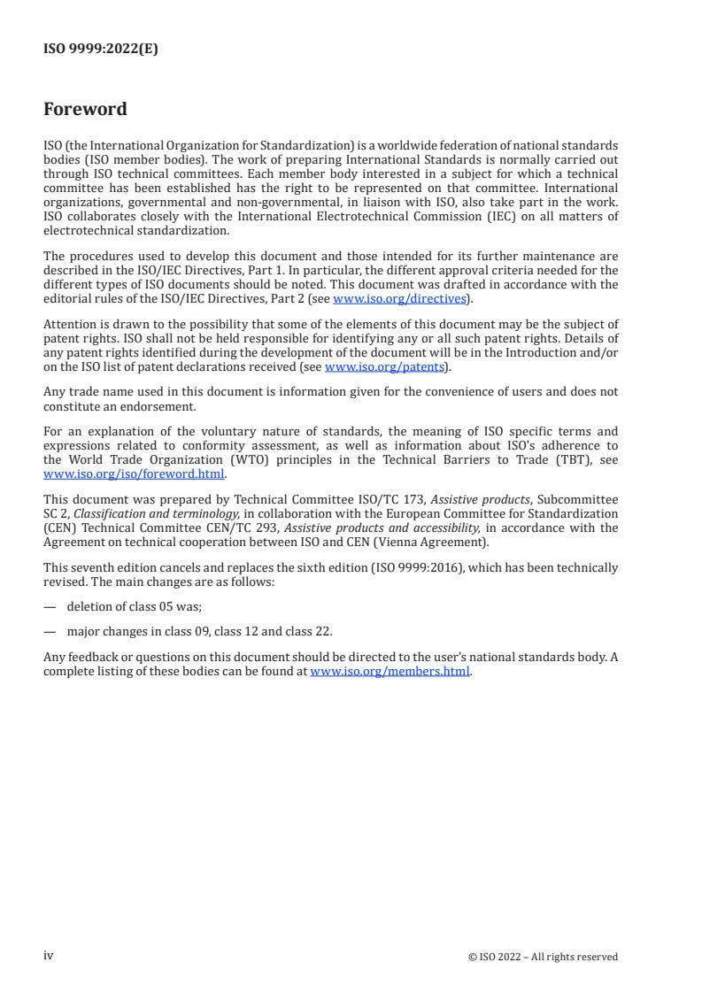ISO 9999:2022 is a standard published by the International Organization for Standardization (ISO). Its full title is "Assistive products - Classification and terminology". This standard covers: This document specifies a classification and terminology of assistive products, especially produced or generally available, for persons to optimize functioning and reduce disability. Assistive products used by a person to optimize functioning and reduce disability, but which require the assistance of another person for their operation, are included in the classification. The following items are specifically excluded from this document: - items used for the installation of assistive products; - solutions obtained by combinations of assistive products that are individually classified in this document; - medicines; - assistive products and instruments used exclusively by healthcare professionals or by teachers; - non-technical solutions, such as personal assistance, guide dogs or lip-reading; - implanted devices; - financial support.