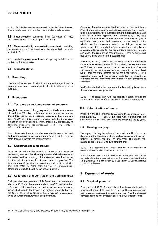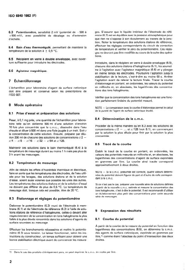 ISO 6840:1982 is a standard published by the International Organization for Standardization (ISO). Its full title is "Cationic surface active agents (Hydrochlorides and hydrobromides) - Determination of critical micellization concentration - Method by measurement of counter ion activity". This standard covers: The determination is carried out as follows: Potentiometric determination of the chloride or bromide ion activity of a series of solutions of cationic surface active agents the concentration of which cover the expected micellization concentration. Plotting the graph of potential as a function of the logarithm of the concentration; the c.m.c. corresponds to the singularity on this curve. The method is applicable to purified cationic surface active agents (hydrochlorides and/or hydrobromides), which are soluble in water and which have a Krafft temperature below 60 degree Celsius.
