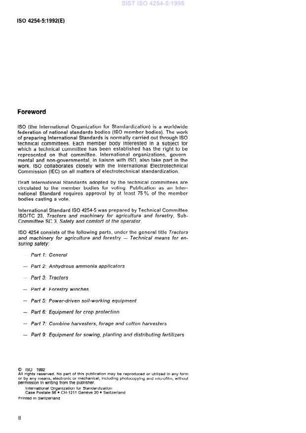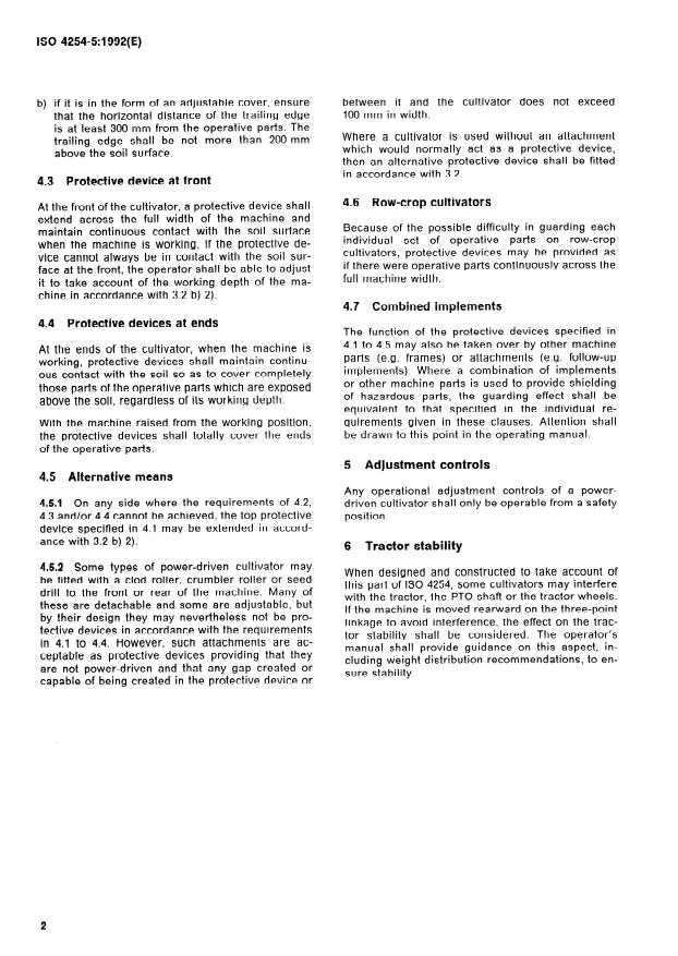ISO 4254-5:1992 is a standard published by the International Organization for Standardization (ISO). Its full title is "Tractors and machinery for agriculture and forestry — Technical means for ensuring safety — Part 5: Power-driven soil-working equipment". This standard covers: Specifies the special requirements to be met in design. Applies to equipment of class 03 with a power demand of more than 20 kW. Applies additionally to ISO 4254-1.